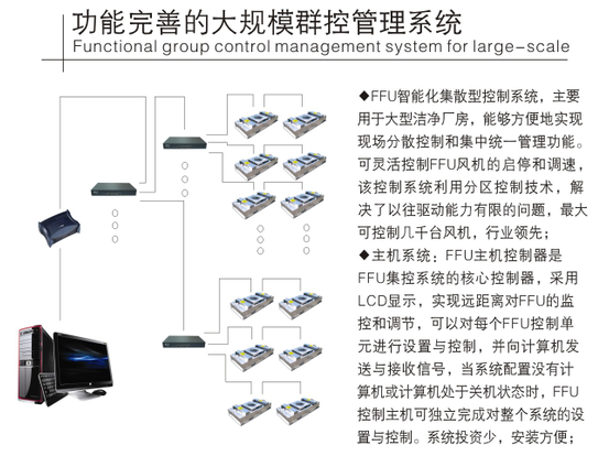 FFU群控系統(tǒng),主要用于大型潔凈房間,能夠方便地實現(xiàn)現(xiàn)場分散控制和集中統(tǒng)一管理功能。可靈活控制FFU風機的啟停和調速,該控制系統(tǒng)利用分區(qū)控制技術,解決了485驅動能力有限的問題,最大可控制幾千臺風機,F(xiàn)FU群控系統(tǒng),高等級凈化廠房使用。