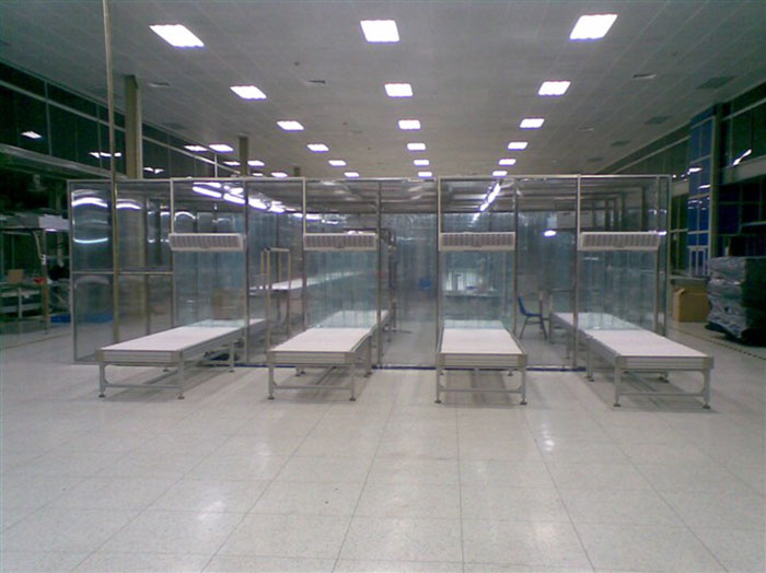 材料以鋼方通噴塑作為框架,采用風(fēng)機(jī)濾網(wǎng)機(jī)組FFU送風(fēng),凈化棚四周圍用防靜電垂簾,頂部鋪蓋密縫盲板,形成一個密縫區(qū),內(nèi)部凈化級別可達(dá)10—100000級;特別適用于車間內(nèi)局部凈化級別要求高的區(qū)域,如流水線作業(yè)區(qū)域。高精確度產(chǎn)品組裝區(qū)。