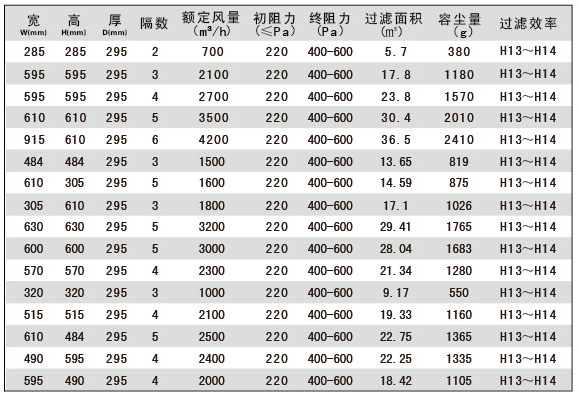 用戶選購指南-260度耐高溫高效過濾器技術參數