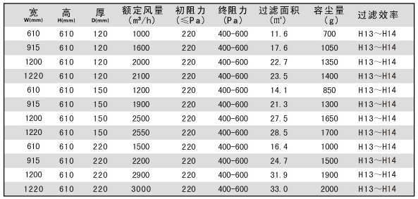 過(guò)濾效率:99.99%-99.995%(H13、H14) MPPS