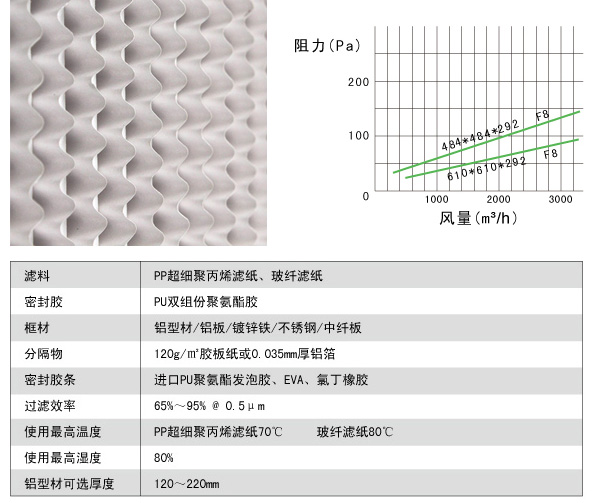 折疊板式中效過濾器采用超細化纖纖維濾料,容塵量大,使用周期內效率穩定。