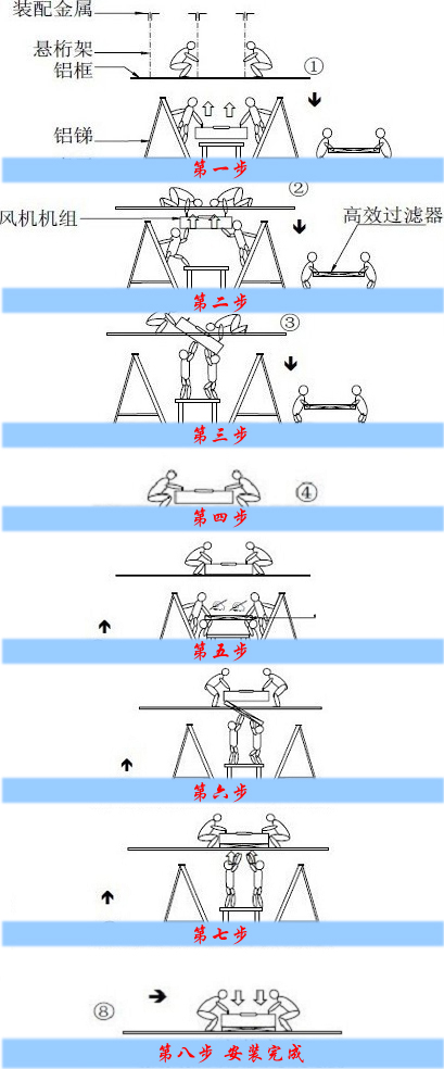 在天花板上的兩位人員把FFU抬起來,潔凈室內的兩位工作人員踩著桌子把過濾器傾斜傳遞到龍骨上(高效過濾器應處在迎風面方向),由于高效過濾器的濾芯是非常脆弱、易損的,所以在安裝傳遞過程中只能握緊它的邊框,輕拿輕放,不能接觸其內部的濾芯,堅決避免碰撞濾芯。